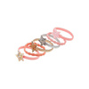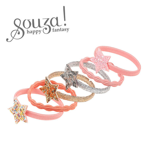 Komplet sześciu gumek do włosów z brokatowymi gwiazdkami Angelie holenderskiej marki Souza! W skład zestawu wchodzą: różowa gumka z multikolorową gwiazdką, morelowa gumka strukturalna, złota gumka ze złotą gwiazdką, srebrna gumka ze srebrną gwiazdką, różowa gumka strukturalna oraz różowa guma z różową gwiazdką. Gumki są mocne i solidne. Idealne do tworzenia fryzur zarówno na przyjęcia, jak i na co dzień. Nadają się także na prezent.