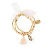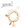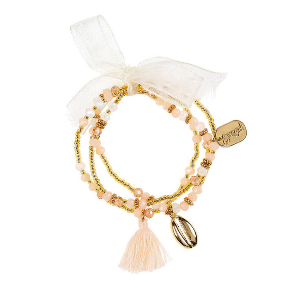 Bransoletka 3 w 1 Evette holenderskiej marki Souza! składa się z trzech rzędów (15 cm) drobnych złotych koralików oraz białych i jasnoróżowych kryształków. Dodatkowo zdobi ją jasnoróżowy chwościk, biała tiulowa kokarda i dwie zawieszki: złote ziarno kawy i złota blaszka z logo marki. Biżuteria jest lekka, delikatna, nietoksyczna i nie podrażnia skóry. Idealna zarówno na przyjęcia, jak i na co dzień. Sprawdzi się także jako stylowy prezent.