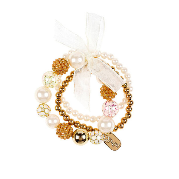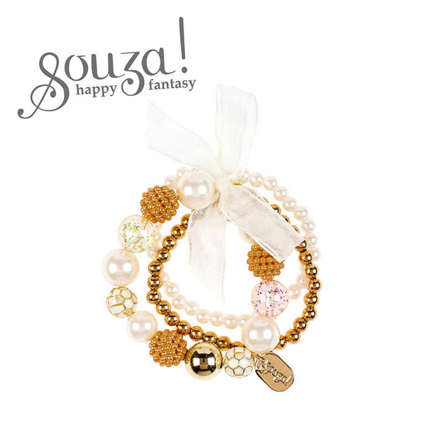 Bransoletka 3 w 1 Marceline holenderskiej marki Souza! składa się z trzech rzędów (15 cm) perełek: dwóch mniejszych – białych i złotych i jednego złożonego z dużych pereł o różnej strukturze, np. transparentnej z drobinkami brokatu, białej ze złotymi żyłkami czy złotej z kuleczek. Dodatkowo zdobi ją biała tiulowa kokardka i złota zawieszka – blaszka z logo marki. Biżuteria jest lekka, delikatna, nietoksyczna i nie podrażnia skóry. Idealna zarówno na przyjęcia, jak i na co dzień. Sprawdzi się także jako stylowy prezent.