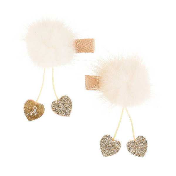 Komplet dwóch spinek do włosów z futerkowymi pomponami Amandine holenderskiej marki Souza! Ozdobne białe pompony z futerka uzupełnione są wisiorkami – na kremowych sznureczkach umieszczone są srebrno-złote brokatowe serduszka. Metalowa część spinek pokryta jest kremowym materiałem (rypsową wstążką). Ząbkowane zaciski sprawiają, że ozdoby stabilnie trzymają się włosów. Idealne zarówno na przyjęcia, jak i na co dzień. Nadają się także na prezent.