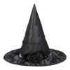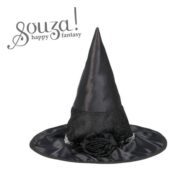 Kapelusz czarownicy Julietta holenderskiej marki Souza! Wysoki, trójkątny kapelusz z rondem wykonany został z czarnej satyny i brokatowego tiulu. Zachwyca perfekcyjnymi detalami – oprócz szerokiej tiulowej taśmy wykończony jest także węższą srebrną wstążką, a przy rondzie – czarnymi piórami i tiulową różą. Ma przyjemne, miękkie wnętrze i jest wygodny do noszenia. Regulowany na rzep obwód może wynosić od 49 do maksymalnie 56 cm. Stanowi idealny dodatek do kostiumu na bal przebierańców czy Halloween. Sprawdzi się także jako prezent.