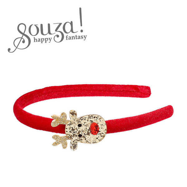 Opaska świąteczna z brokatowym reniferem holenderskiej marki Souza! Obciągniętą czerwonym aksamitem opaskę zdobi złota brokatowa aplikacja-renifer. Opaska jest lekka, delikatna i przyjemna w noszeniu (ma optymalną szerokość – 1 cm – i nie uciska). Idealna na okres adwentu i wszystkie świąteczne przyjęcia. Sprawdzi się także jako stylowy prezent.