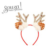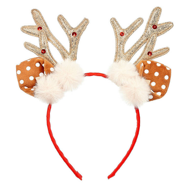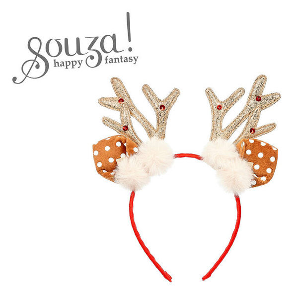 Opaska świąteczna z uszkami i rogami renifera holenderskiej marki Souza! Obciągniętą czerwoną wstążką opaskę zdobią złote brokatowe rogi z czerwonymi cekinami, jasnobrązowe uszka w jasne kropki oraz jasne futerkowe pompony – po 2 przy każdym uchu. Opaska jest lekka, delikatna i przyjemna w noszeniu (ma optymalną szerokość – 1 cm – i nie uciska). Idealna na okres adwentu i wszystkie świąteczne przyjęcia. Sprawdzi się także jako stylowy prezent.