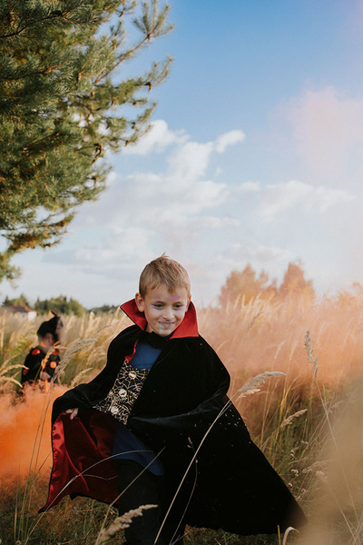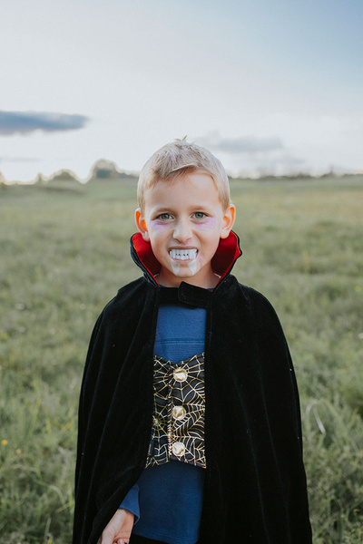 Kostium Dracula holenderskiej marki Souza! to przepiękne, kunsztownie wykonane przebranie, które składa się z peleryny i wampirzych zębów – nakładki na górną i dolną szczękę z dłuższymi kłami. Peleryna zachwyca dbałością o detale. Jest efektowna, czarna, uszyta z miękkiego aksamitu, z intensywnie czerwoną podszewką. Ma wysoki stojący kołnierz, zintegrowaną kamizelkę ze złotym wzorem pajęczej sieci i zapięcie na rzep pod szyją. Jest przyjemna w dotyku i komfortowa do noszenia. To idealny strój na bal przebierańców, Sylwestra czy Halloween. Sprawdzi się także jako prezent.