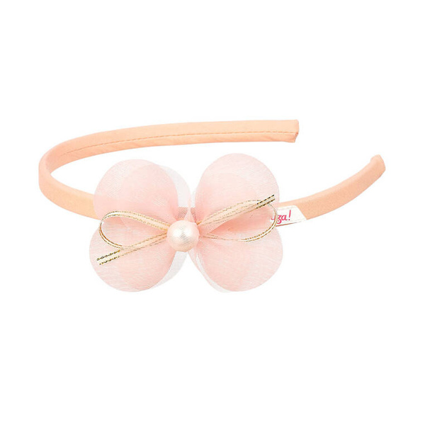 Opaska z kwiatem i perłą Lotus holenderskiej marki Souza! Obciągniętą brzoskwiniową tkaniną opaskę zdobi materiałowy jasnoróżowy kwiat z perłą pośrodku i wstążeczką ze złotym brzegiem pomiędzy płatkami. Opaska jest lekka, delikatna i przyjemna w noszeniu (ma optymalną szerokość – 1 cm – i nie uciska). Idealna zarówno na przyjęcia, jak i na co dzień. Sprawdzi się także jako stylowy prezent.
