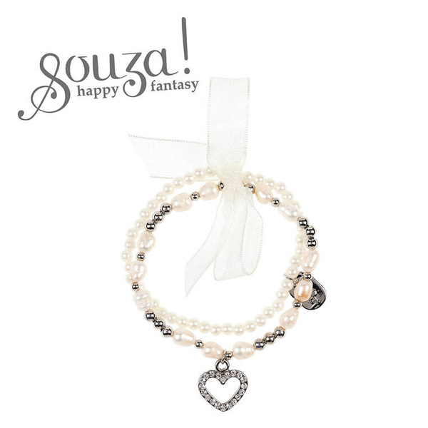 Bransoletka 3 w 1 Bliss holenderskiej marki Souza! składa się z trzech rzędów (15 cm) drobnych srebrnych koralików i białych perełek w dwóch rozmiarach. Dodatkowo zdobi ją biała tiulowa kokardka i dwie zawieszki: srebrne serduszko wysadzane kryształkami i srebrna blaszka z logo marki. Biżuteria jest lekka, delikatna, nietoksyczna i nie podrażnia skóry. Idealna zarówno na przyjęcia, jak i na co dzień. Sprawdzi się także jako stylowy prezent.