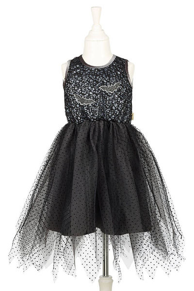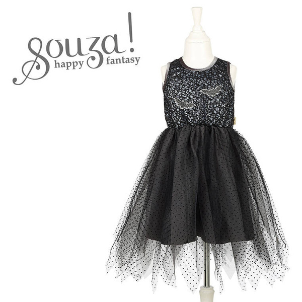 Kostium sukienka z nietoperzami Mathilde holenderskiej marki Souza! to przepiękne, kunsztownie wykonane przebranie dla dziewczynki. Ma klasyczny krój z szerokimi ramiączkami, gumkę w pasie i zapięcie na suwak na plecach. Zachwyca dbałością o detale. Góra sukienki jest uszyta z grafitowego aksamitu, który z przodu zdobiony jest czarną siateczką i aplikacjami-nietoperzami. Dół to urokliwa spódniczka z czarną podszewką i dwoma warstwami czarnego tiulu w kropeczki i z ząbkowanym brzegiem. Sukienka jest komfortowa do noszenia. Idealna na bal przebierańców, Halloween czy Sylwestra. Sprawdzi się także jako prezent.