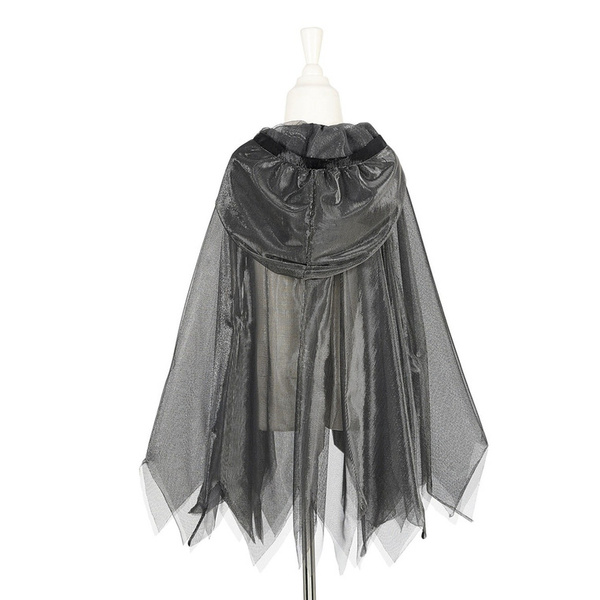 Kostium peleryna z obszernym kapturem Mathilde holenderskiej marki Souza! to przepiękne, kunsztownie wykonane przebranie dla dziewczynki. Peleryna zachwyca dbałością o detale. Jest efektowna, z dwóch warstw czarnego tiulu, zwiewna i prześwitująca, z aplikacjami nietoperzy. Ma ząbkowany brzeg i szeroką aksamitną lamówkę na przodzie i wokół kaptura. Zapinana pod szyją na guziczki z pętelką – perełki. Komfortowa do noszenia. Idealna jako dodatek do stroju wiedźmy czy wampirzycy lub samodzielny kostium na bal przebierańców, Halloween czy Sylwestra. Sprawdzi się także jako prezent.
