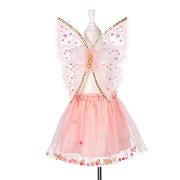 Kostium spódniczka ze skrzydłami elfa Lusianne holenderskiej marki Souza! to przepiękne, kunsztownie wykonane przebranie dla dziewczynki. Spódniczka ma klasyczny rozkloszowany krój i gumkę w pasie. Zachwyca dbałością o detale. Składa się z gładkiej różowej podszewki i dwóch warstw tiulu, wewnątrz których umieszczone są kolorowe mini-pomponiki. Tę wierzchnią zdobią również brokatowe serduszka. W skład zestawu wchodzą także półprzeźroczyste skrzydła elfa z różowymi brokatowymi wzorami i złotymi detalami. Można je nosić razem ze spódniczką lub osobno. Zakładane są na wygodne gumowane ramiona. Strój jest efektowny i komfortowy. Idealny na wszelkie przyjęcia, bale przebierańców czy Sylwestra. Sprawdzi się także jako prezent.