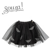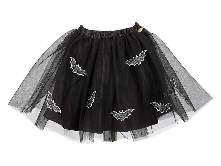 Kostium spódniczka w nietoperze Mathilde holenderskiej marki Souza! to przepiękne, kunsztownie wykonane przebranie dla dziewczynki. Ma klasyczny rozkloszowany krój i dość szeroką gumkę w pasie, obszytą satynowym materiałem. Zachwyca dbałością o detale. Składa się z gładkiej czarnej podszewki i dwóch warstw czarnego tiulu. Tę wierzchnią zdobią brokatowe aplikacje – nietoperze. Spódniczka jest komfortowa do noszenia. To idealne ubranie na wszelkie przyjęcia, bale przebierańców, Halloween czy Sylwestra. Sprawdzi się także jako prezent.