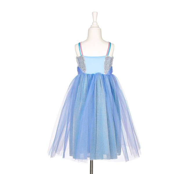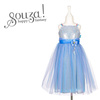 Sukienka wizytowa tiulowa Celena holenderskiej marki Souza! to przepiękne, kunsztownie wykonane ubranie dla dziewczynki. Ma klasyczny krój na ramiączkach z wyższą osłoną dekoltu i gumkę w pasie. Jest miękka i wsuwana przez głowę. Zachwyca dbałością o detale. Góra tej niebieskiej sukienki jest dwustronna: z przodu jest zdobiona cekinami, z tyłu zaś ma elastyczny, półprzeźroczysty turkusowy materiał. Podwójne ramiączka to niebieska i różowa aksamitka. Dół stanowi urokliwa trójwarstwowa spódniczka z dwiema warstwami tiulu (niebieską i fioletową), mieniącego się drobinkami srebrnego brokatu. Strój ma ponadto w pasie szerszy pasek z upiętego ciemniejszego, niebieskiego tiulu i materiałowy niebieski kwiat z dwoma paskami ze srebrnych cekinów. Sukienka jest przyjemna w dotyku i komfortowa do noszenia. To idealne ubranie na wszelkie przyjęcia (np. wesele czy urodziny), bale przebierańców czy Sylwestra. Sprawdzi się także jako prezent.