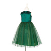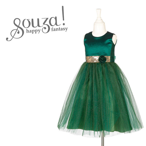 Sukienka wizytowa tiulowa Luisa holenderskiej marki Souza! to przepiękne, kunsztownie wykonane ubranie dla dziewczynki. Ma klasyczny krój na szerokich ramiączkach, gumkę w pasie i zapięcie na suwak na plecach. Zachwyca dbałością o detale. Góra tej ciemnozielonej sukienki jest wykonana z połyskującej lekko kreszowanej satyny z misternie haftowanymi pasami po bokach. Dół stanowi trójwarstwowa spódniczka z dwiema warstwami tiulu, mieniącego się drobinkami złotego brokatu. Strój ma ponadto szerszy złoty pasek z cekinami w pasie, a przy nim – satynową zieloną różę. Sukienka jest przyjemna w dotyku i komfortowa do noszenia. To idealne ubranie na wszelkie przyjęcia (np. wesele czy urodziny), bale przebierańców czy Sylwestra. Sprawdzi się także jako prezent.