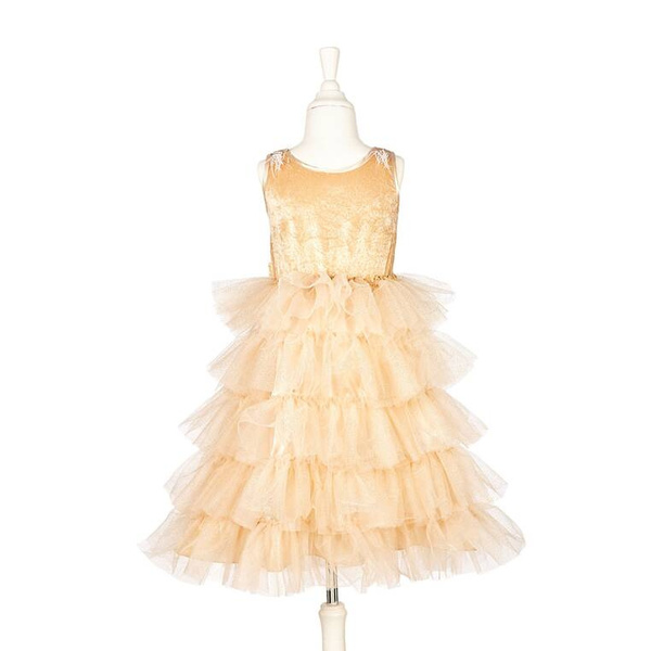 Sukienka wizytowa tiulowa Christianne holenderskiej marki Souza! to przepiękne, kunsztownie wykonane ubranie dla dziewczynki. Ma klasyczny krój z szerokimi ramiączkami i gumkę w pasie, Jest miękka i wsuwana przez głowę. Zachwyca dbałością o detale. Góra tej złotej sukienki jest dwustronna: z przodu ma warstwę drobnych złotych cekinów, z tyłu zaś jest aksamitna, a przy ramionach ozdobiona kilkoma białymi piórkami. Dół stanowi urokliwa wielowarstwowa tiulowa spódniczka z falbanami – wierzchni tiul jest w złote brokatowe kropeczki. Sukienka jest przyjemna w dotyku i komfortowa do noszenia. To idealne ubranie na wszelkie przyjęcia (np. wesele czy urodziny), bale przebierańców czy Sylwestra. Sprawdzi się także jako prezent.