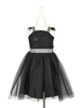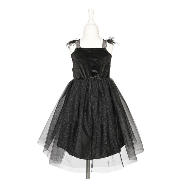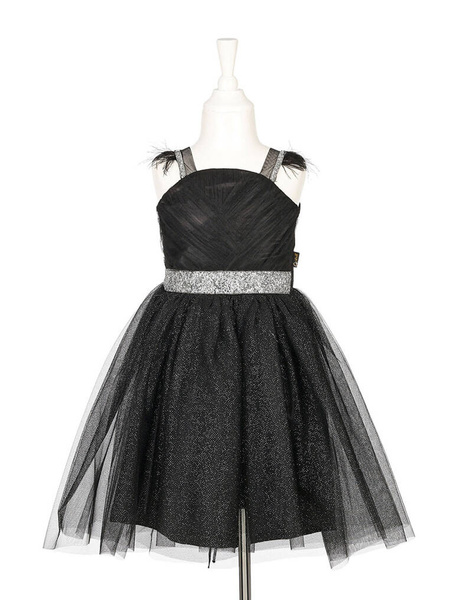 Sukienka wizytowa tiulowa Julietta holenderskiej marki Souza! to przepiękne, kunsztownie wykonane ubranie dla dziewczynki. Ma klasyczny krój na ramiączkach z wyższą osłoną dekoltu i gumkę w pasie. Jest miękka i wsuwana przez głowę. Zachwyca dbałością o detale. Góra tej czarnej sukienki jest dwustronna: z przodu ma warstwę drapowanego tiulu, z tyłu zaś jest aksamitna, przy tiulowych ramiączkach ozdobiona jest czarnym długowłosym futerkiem. Dół stanowi urokliwa trójwarstwowa spódniczka z dwiema warstwami tiulu, mieniącego się drobinkami srebrnego brokatu. Strój ma ponadto szerszy srebrny pasek z cekinami i kryształkami w pasie. Sukienka jest przyjemna w dotyku i komfortowa do noszenia. To idealne ubranie na wszelkie przyjęcia (np. wesele czy urodziny), bale przebierańców, Sylwestra czy Halloween. Sprawdzi się także jako prezent.