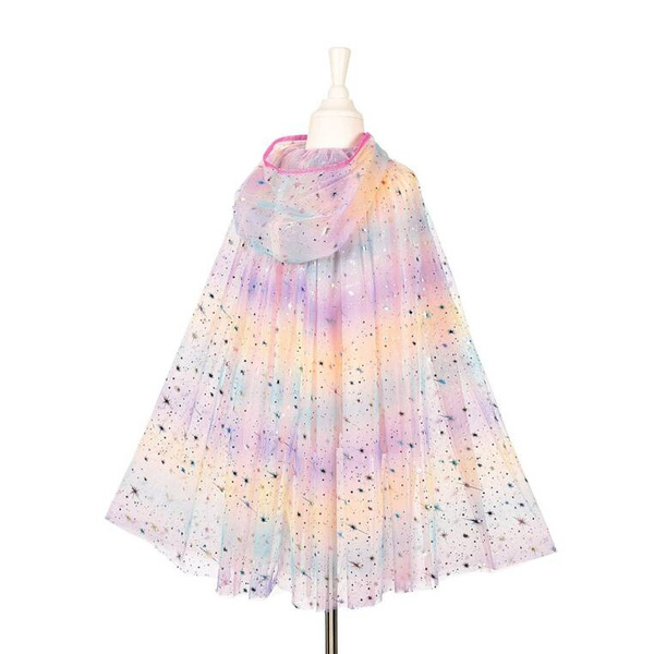Kostium peleryna z obszernym kapturem Julyanne holenderskiej marki Souza! to przepiękne, kunsztownie wykonane przebranie dla dziewczynki. Peleryna zachwyca dbałością o detale. Jest efektowna, tiulowa, zwiewna, tęczowa w gwiazdy, obszyta fuksjową lamówką wokół kaptura. Zapinana pod szyją na guziczki z pętelką – perełki. Komfortowa do noszenia. Idealna jako dodatek do stroju wróżki czy elfa lub samodzielny kostium na bal przebierańców czy Sylwestra. Sprawdzi się także jako prezent.