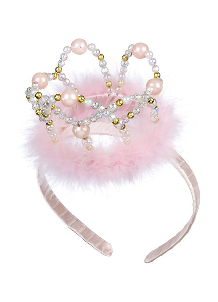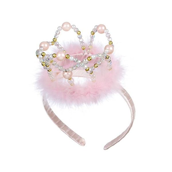 Opaska/tiara z futerkiem i koroną Alexandra holenderskiej marki Souza! Obciągniętą satynową tkaniną opaskę zdobi długowłose jasnoróżowe futerko i ręcznie robiona korona z białych, złotych i jasnoróżowych perełek różnej wielkości. Opaska jest lekka, delikatna i przyjemna w noszeniu (ma optymalną szerokość – 1 cm – i nie uciska). Idealna na przyjęcia i jako uzupełnienie przebrania księżniczki. Sprawdzi się także jako stylowy prezent.