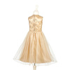 Sukienka wizytowa tiulowa Noraline holenderskiej marki Souza! to przepiękne, kunsztownie wykonane ubranie dla dziewczynki. Ma klasyczny krój z szerokimi ramiączkami, gumkę w pasie i zapięcie na suwak na plecach. Zachwyca dbałością o detale. Góra tej złotej sukienki jest haftowana grubszym ściegiem w fantazyjny kwiatowy wzór, a dół to urokliwa trójwarstwowa spódniczka z dwiema warstwami tiulu – wierzchnia jest w złote brokatowe kropeczki – i jedną z delikatnej satyny. W talii z przodu strój zdobi ponadto róża. Sukienka jest przyjemna w dotyku i komfortowa do noszenia. To idealne ubranie na wszelkie przyjęcia (np. wesele czy urodziny), bale przebierańców czy Sylwestra. Sprawdzi się także jako prezent.
