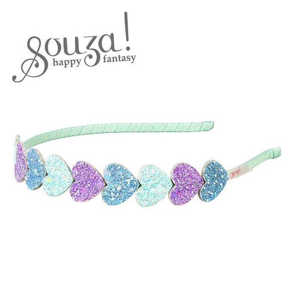 Opaska z brokatowymi serduszkami Samantha holenderskiej marki Souza! Obciągniętą miętową wstążką metalową opaskę (0,5 cm szerokości) zdobi 9 obsypanych brokatem aplikacji-serduszek w trzech kolorach: niebieskim, fioletowym i jasnoniebieskim. Opaska jest lekka, delikatna i przyjemna w noszeniu (nie uciska). Idealna zarówno na przyjęcia, jak i na co dzień. Sprawdzi się także jako stylowy prezent.