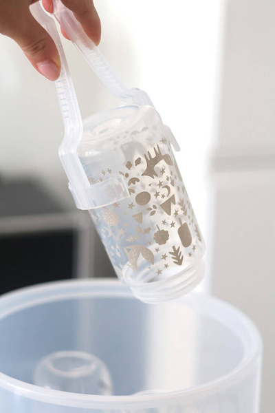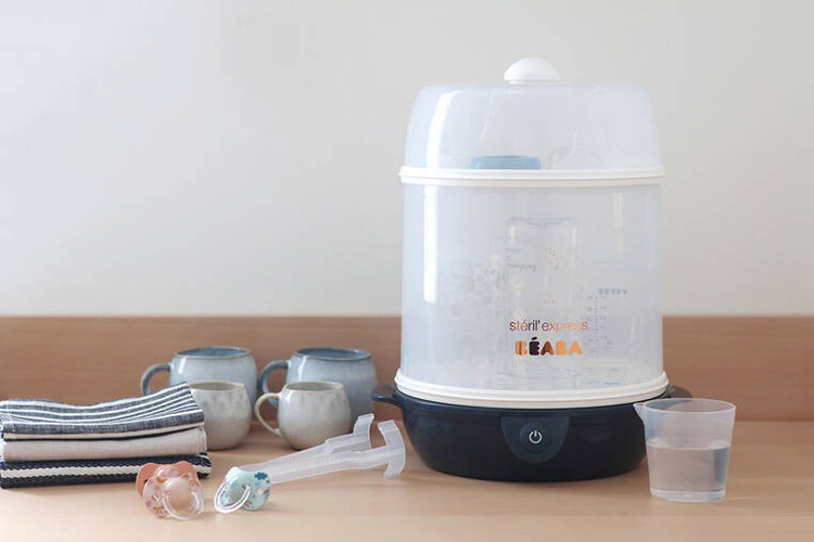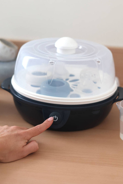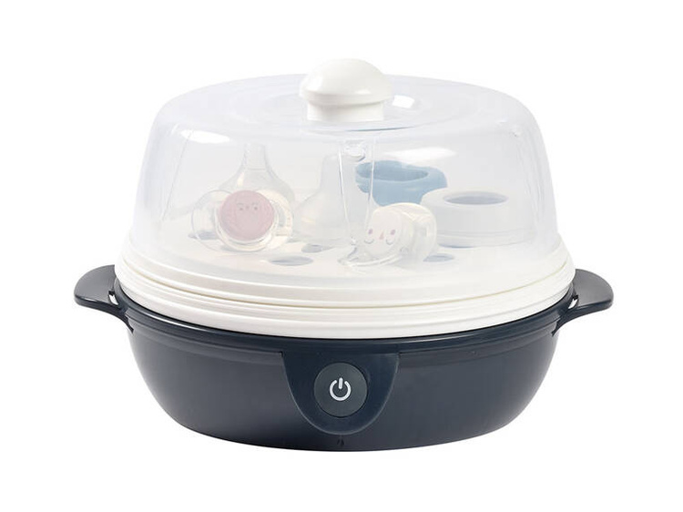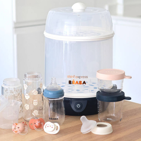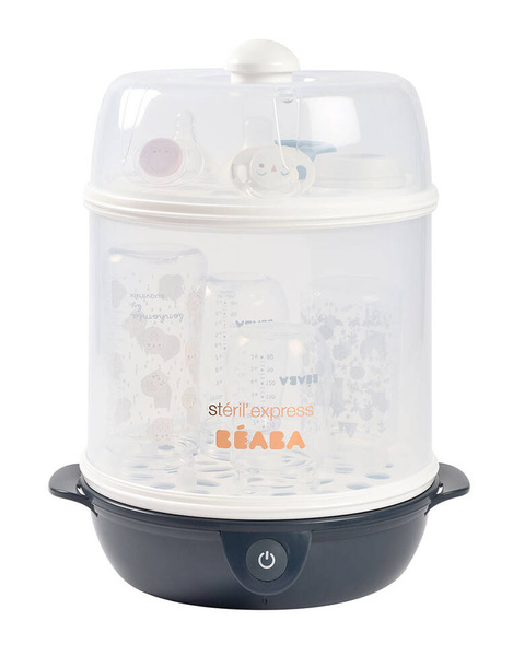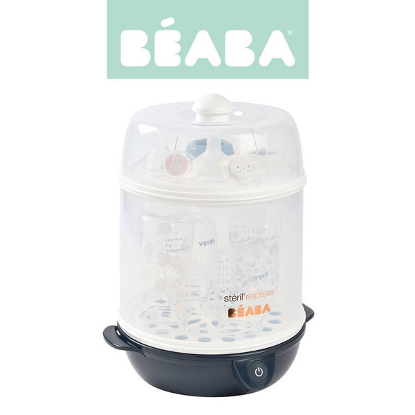 Ultra szybki sterylizator parowy 2w1 francuskiej marki BEABA. W zaledwie 6 minut skutecznie eliminuje aż 99,9% bakterii (m. in. salmonellę, enterobakterie czy listerię). Jego wnętrze podzielone jest na dużą i małą przestrzeń, których można używać jednocześnie lub osobno, w zależności od aktualnej potrzebny. Na pełnej powierzchni (metoda maxi) pomieści do 9 wąskich i do 6 szerokich butelek wraz z dodatkami. Mniejszy pojemnik (metoda mini) będzie z kolei idealny do sterylizacji tylko drobnych akcesoriów, np. smoczków. Po zakończeniu cyklu urządzenie samo się wyłącza.