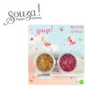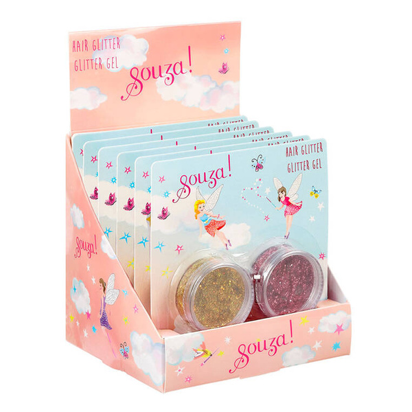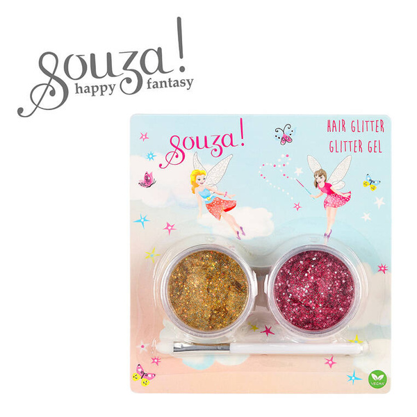 Zestaw brokatów do włosów dla dzieci holenderskiej marki Souza! składa się z 2 pojemniczków z brokatem w żelu (fuksjowym i złotym, po 15 g każdy) oraz aplikatora z miękką końcówką. Przetestowany dermatologicznie, w pełni bezpieczny, nie uczula, nie podrażnia i nie wysusza skóry głowy. Brokat łatwo się zmywalna ciepłą wodą z szamponem. Idealny na przyjęcia, urodzinki, zabawę w salon kosmetyczny oraz jako stylowy prezent.