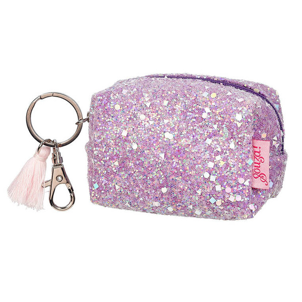 Portfel etui dla dzieci Lyna holenderskiej marki Souza! to nieduży, ale całkiem pojemny dodatek. Zapinany na suwak, pokryty sporymi drobinkami fioletowego holograficznego brokatu. Przy zamku ma kółko breloczka, karabińczyk i ozdobny, jasnoróżowy chwost. Sprawdzi się do przechowywania np. mniejszych szkolnych przyborów (kredki świecowe, gumki), pomieści klucze, kieszonkowe i inne niezbędne drobiazgi. Idealny do noszenia na co dzień, np. przy plecaku. Nadaje się także na prezent.