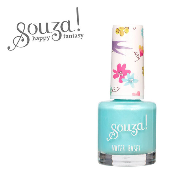 Lakier do paznokci dla dzieci holenderskiej marki Souza! w pięknym jasno miętowym kolorze z perłowym połyskiem. Wykonany na bazie wody kosmetyk jest w pełni bezpieczny, nie uczula i nie podrażnia skóry. Tworzy na płytce warstwę peel-off, dzięki czemu bez trudu usuwa się go z paznokci (jak naklejki). Idealny na przyjęcia, urodzinki, zabawę w salon kosmetyczny czy jako prezent. Buteleczka ma 8 ml pojemności i nakrętkę w zabawne kolorowe kleksy.
