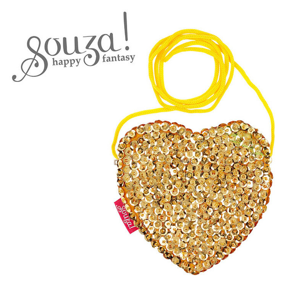 Torebka dla dzieci Emma holenderskiej marki Souza! ma kształt serca i pokryta jest złotymi cekinami. Zapinana na suwak, z długim (ok. 50 cm), miękkim, intensywnie żółtym sznurkiem do przewieszenia przez ramię. Pomieści niezbędne drobiazgi. Idealna jako dodatek do stroju wizytowego, np. na przyjęcia, jak i do noszenia na co dzień. Nadaje się także na prezent.