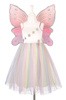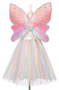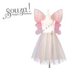 Kostium sukienka ze skrzydłami motyla Louanne holenderskiej marki Souza! to przepiękne, kunsztownie wykonane przebranie dla dziewczynki. Sukienka ma klasyczny krój na ramiączkach i gumkę w pasie. Jest miękka i wsuwana przez głowę. Zachwyca dbałością o detale. Góra sukienki jest biała i aksamitna z aplikacjami srebrnych gwiazdek na przodzie, dół zaś stanowi spódniczka z podszewką i kilkoma warstwami tęczowego pastelowego tiulu. W skład zestawu wchodzą także półprzeźroczyste różowo-fioletowe skrzydła ze srebrnymi wzorami i brzegiem. Można je nosić razem z sukienką lub osobno. Zakładane na ramiona za pomocą wygodnych gumek obszytych materiałem. Strój jest efektowny i komfortowy do noszenia. To idealne przebranie na bal przebierańców czy Sylwestra. Sprawdzi się także jako prezent.