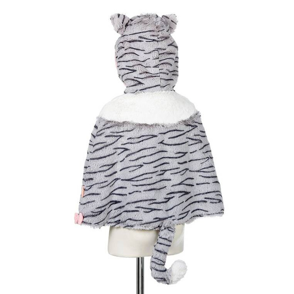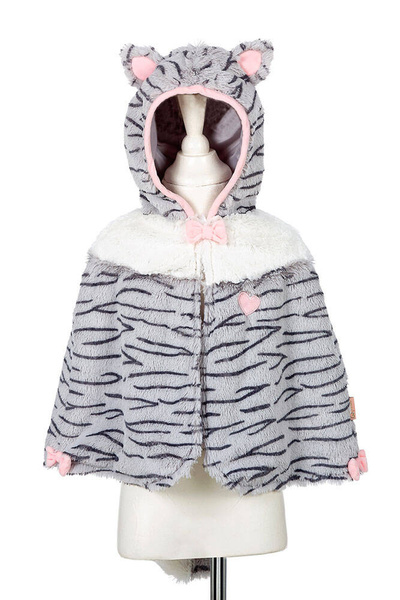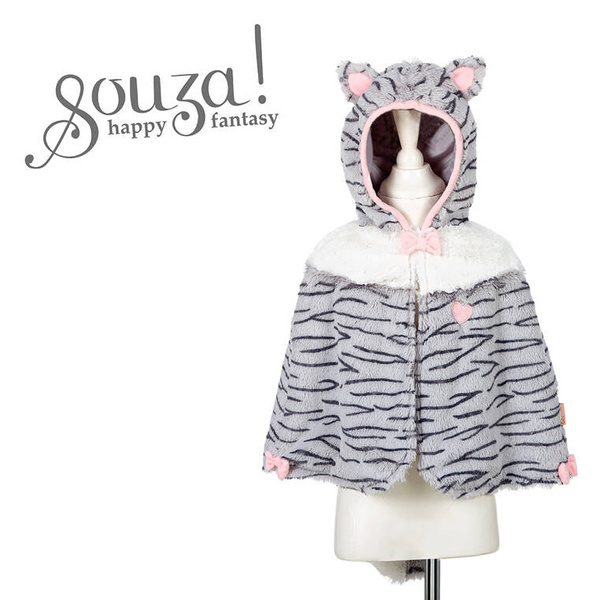 Pluszowa narzutka z kapturem kotka Catia holenderskiej marki Souza! to przepiękne uzupełnienie lub samodzielna przebranie dla dziewczynek. Jest efektowna, szara w czarne prążki, ma biały futerkowy kołnierzyk, różowe detale (kokardki, obszycia i wnętrze uszek przy kapturze), jak również długi szary prążkowany ogon z białą końcówką. Jest miękka i przyjemna w dotyku. Zapinana pod szyją na haftkę. Komfortowa do noszenia. Nadaje się także na prezent.