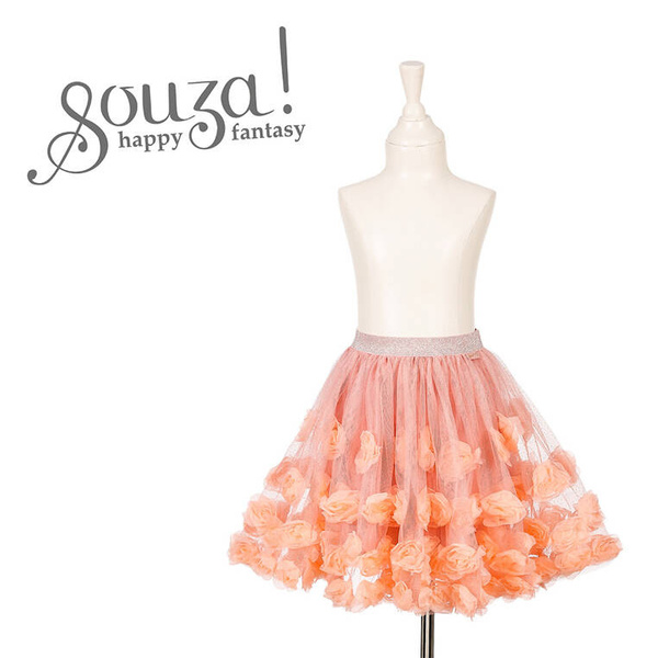 Kostium spódniczka tiulowa w róże Rosanna holenderskiej marki Souza! to przepiękne, kunsztownie wykonane przebranie dla dziewczynki. Ma klasyczny rozkloszowany krój, gumkę w pasie i srebrną, ozdobną taśmę wokół talii. Zachwyca dbałością o detale. Składa się z gładkiej podszewki i kilku warstw różowego tiulu z drobinkami srebrnego brokatu. Wierzchnią warstwę zdobią aplikacje z wielu materiałowych róż w odcieniu brzoskwiniowym. Spódniczka jest komfortowa do noszenia. To idealne ubranie na wszelkie przyjęcia, bale przebierańców czy Sylwestra. Sprawdzi się także jako prezent.