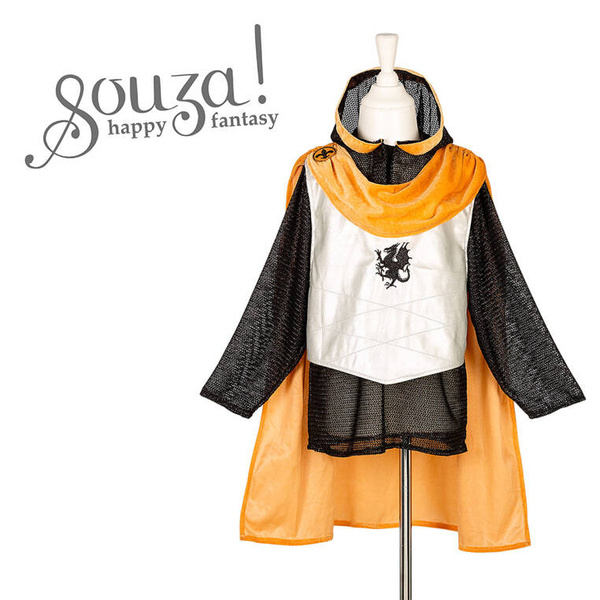 Kostium rycerza Ramon holenderskiej marki Souza! to przepiękne przebranie dla chłopca, które składa się z miękkiej zbroi: czarnej siatki imitującej kolczugę oraz srebrnej pikowanej kamizelki z siateczkowym kapturem, a także pomarańczowej welurowej peleryny. Zbroja jest wkładana przez głowę i zapinana pod szyją na rzep. Na przodzie zbroi widnieje czarny lew/gryf, a kaptur ma szeroką pomarańczową lamówkę z weluru. Peleryna jest długa z zapasem materiału z przodu i ciekawie upięta na ramionach. Strój jest wyjątkowo komfortowy. Idealny na przedstawienia czy bale przebierańców. Sprawdzi się także jako prezent.