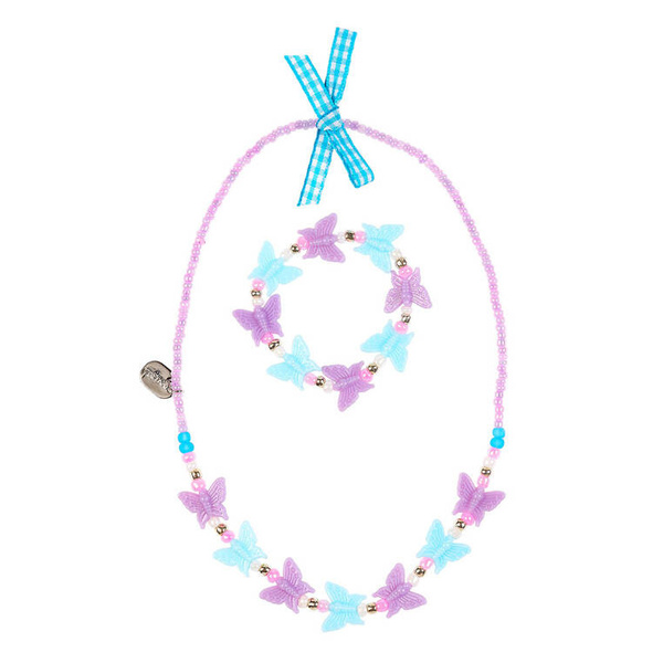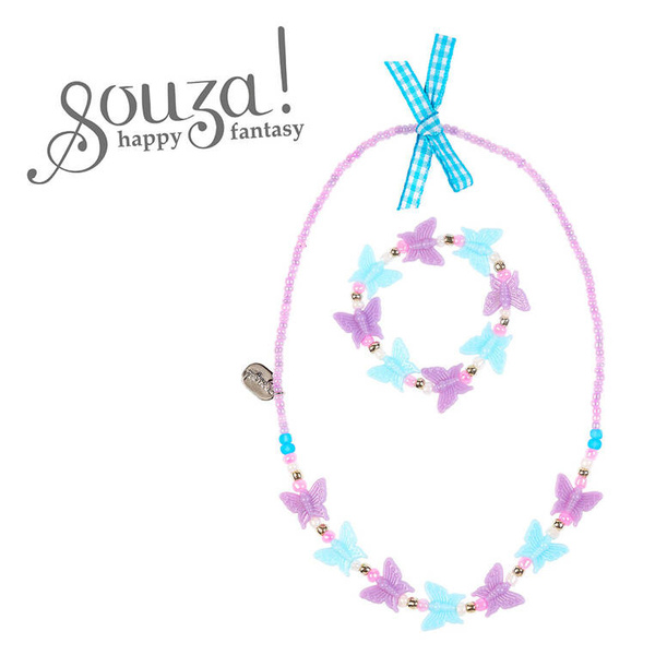 Naszyjnik i bransoletka Esmay holenderskiej marki Souza! to zestaw biżuterii z drobnych koralików i elementów w kształcie motyli w kolorach fioletowym i turkusowym z kilkoma koralikami w bieli, złocie i różu. Bransoletka ma 14 cm obwodu, a naszyjnik – 40 cm i uroczą kokardkę w kratkę na karku. Biżuteria jest nietoksyczna i nie podrażnia skóry. Idealna zarówno na przyjęcia, jak i do noszenia na co dzień. Sprawdzi się także jako stylowy prezent.