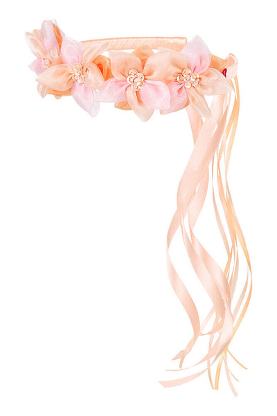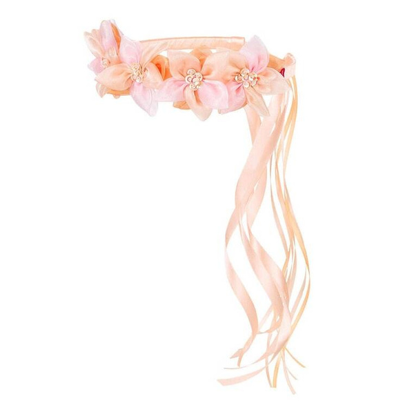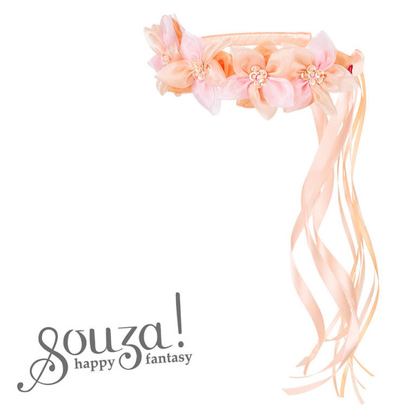 Opaska wianek Evaline holenderskiej marki Souza! Można ją nakładać na włosy lub czoło, jak wianek. Opaskę obciągniętą jasno łososiową satynową wstążką, zdobią spore tiulowe łososiowo-różowe kwiaty z cekinowymi środkami, a na końcach - kilka długich tasiemek różnej szerokości, w kolorach kwiatów. Opaska jest lekka, delikatna i przyjemna w noszeniu (ma optymalną szerokość – 3 cm – i nie uciska). Idealna zarówno na przyjęcia, jak i na co dzień. Sprawdzi się także jako stylowy prezent.