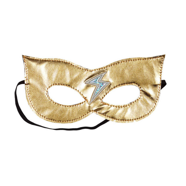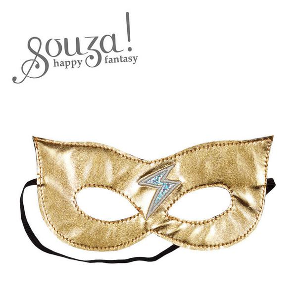Złota maska superbohatera holenderskiej marki Souza! wykonana z przyjemnej w dotyku tkaniny. Zachwyca detalami, m.in. stylowym kształtem i aplikacją srebrnej błyskawicy. Łatwa do zakładania i zdejmowania dzięki gumce. Stanowi idealny dodatek do kostiumu superbohatera, na bal przebierańców, Sylwestra czy tematyczne urodzinki. Sprawdzi się także jako prezent.
