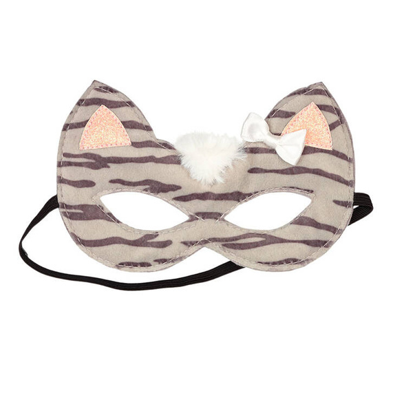 Pluszowa szara prążkowana maska kotki Catia holenderskiej marki Souza! Zachwyca detalami, m.in. różowym brokatowym wypełnieniem uszek, białą kokardką przy uchu i futerkową grzywką. Łatwa do zakładania i zdejmowania dzięki gumce. Stanowi idealny dodatek do kostiumu kotki, na bal przebierańców czy Sylwestra. Sprawdzi się także jako prezent.
