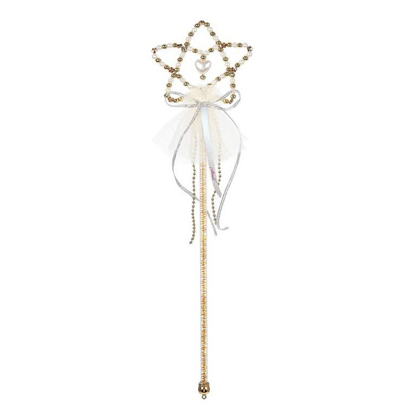 Różdżka z perełkami Coralina holenderskiej marki Souza! Urokliwa różdżka z białymi i złotymi detalami. U góry zdobią ją perełki (na przemian białe i złote), układające się w kształt gwiazdy z perłowym serduszkiem w środku, poniżej zaś biały tiul, srebrna kokardka z cienkiej tasiemki oraz sznur ze złotych koralików. Ma 39 cm długości, jest poręczna i lekka. Stanowi idealny dodatek do kostiumu księżniczki, syrenki czy wróżki. Sprawdzi się także jako prezent.
