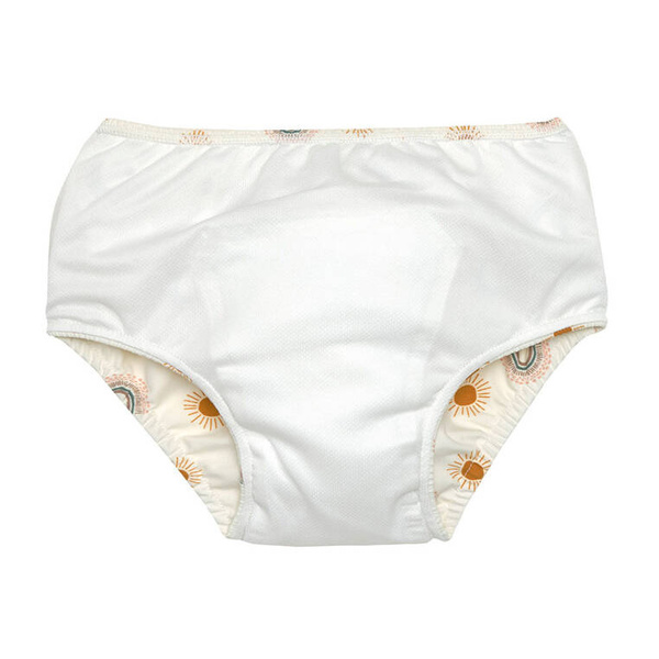 Praktyczna i komfortowa pieluszka do pływania wielokrotnego użytku z chłonną wkładką z kolekcji Splash & Fun niemieckiej marki LASSIG. Wykonana jest z miękkiej, przyjemnej do noszenia i szybkoschnącej mikrofibry. Idealna zarówno na basen, jak i na plażę, do nauki pływania, kąpieli w jeziorze czy morzu oraz wszelkich wodnych zabaw. Jest uszyta w formie wygodnych, poręcznych do nakładania majteczek. Ma nieuciskającą gumkę w pasie i przy otworach na nóżki. Zapewnia swobodę ruchów i maksymalną higienę: wewnętrzna oddychająca i chłonna wkładka z mikropolaru chroni skórę dziecka przed wilgocią, a warstwa zewnętrzna jest plamoodporna i łatwa w pielęgnacji. Wzór Rainbow (Tęcza) to multiprint w tęcze w kilku odcieniach różu, beżu i szarości oraz słoneczka w odcieniu ochry na białym tle. Modele dla dziewczynek wyposażone są dodatkowo w uroczą falbankę z tyłu.