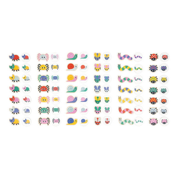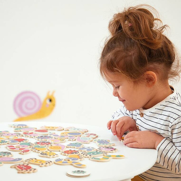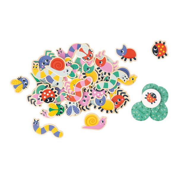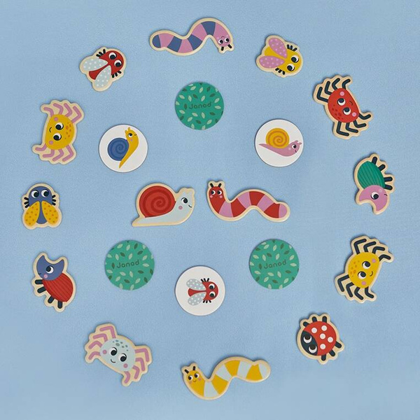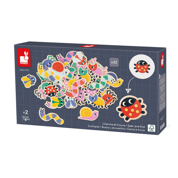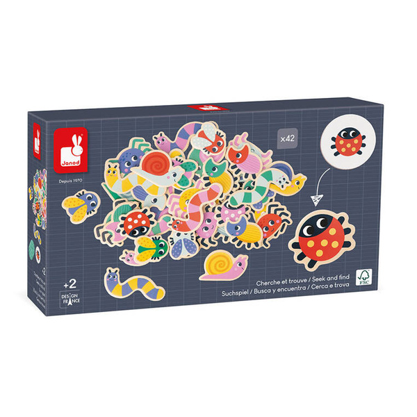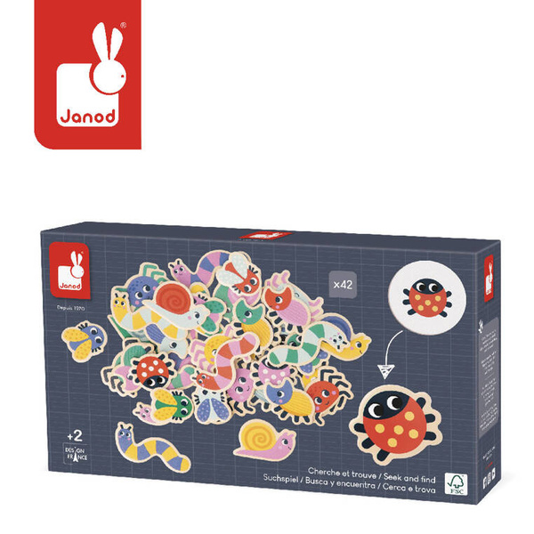Gra w chowanego Ogród francuskiej marki JANOD to wspaniała zabawa dla dwóch lub więcej osób – zarówno dzieci, jak i dorosłych. Zestaw zawiera 42 kolorowe drewniane owady (żuki, dżdżownice, pajączki, biedronki, muszki i ślimaki – po 7 z każdego rodzaju, ale każdy inny kolorystycznie) i tyle samo odpowiadających im kartonowych żetonów w woreczku. Celem gry jest jak najszybsze i bezbłędne odnalezienie wśród chmary stworzeń to, które wskazuje wylosowany żeton. Kto odnajdzie ich najwięcej – wygrywa.