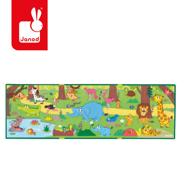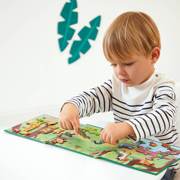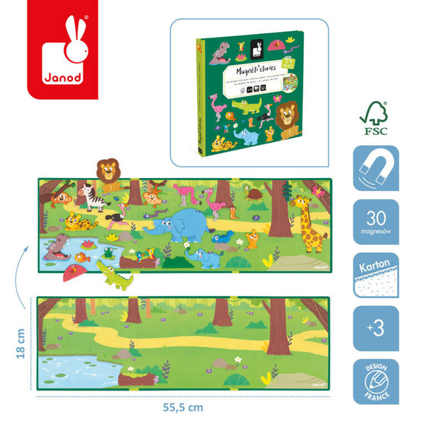 Magnetyczne historie Afrykańskie zwierzęta z linii Magneti'stories francuskiej marki Janod zawiera 30 magnesów – dzikich zwierząt, m in. żyrafę, zebrę, słonie, małpkę, krokodyla, flamingi itp., które stanowią części składowe do stworzenia oryginalnej ilustracji na rozkładanej potrójnej planszy. Magnesy pozwalają na układanie wymyślonych przez siebie opowieści, których bohaterami są mieszkańcy dżungli. To świetna rozrywka dla wszystkich twórczych dzieci.