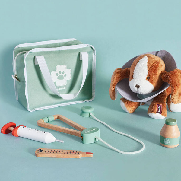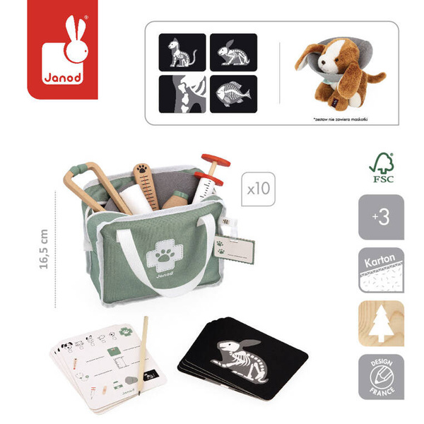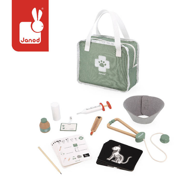 Zestaw weterynarza z akcesoriami francuskiej marki JANOD to idealna zabawka dla dzieci lubiących odtwarzać codziennie sytuacje, takie jak wizyta z pupilem w przychodni. W torbie znajdziemy: 1 strzykawkę, 1 termometr, 1 bandaż, 1 stetoskop, 1 buteleczkę z „lekarstwem”, 1 filcowy kołnierz, 4 recepty, 4 zdjęcia rentgenowskie, 1 wizytówkę weterynarza do wyplenienia i 1 ołówek. Większość elementów wykonana została z drewna lub solidnego kartonu, pomalowana bezpiecznymi dla dzieci farbami. Akcesoria są precyzyjne i bardzo estetyczne, utrzymane w odcieniach bieli i pastelowej zieleni. Zabawa nimi to sama przyjemność, zwłaszcza dla dzieci, które lubią naśladować dorosłych – takie zabawy pomagają im oswajać się z codziennością i przyswajać zasady społecznych zachowań. Prostokątna torba jest zapinana na suwak i ma charakterystyczny znak krzyża z odciskiem łapki wewnątrz. Idealnie nadaje się na prezent.