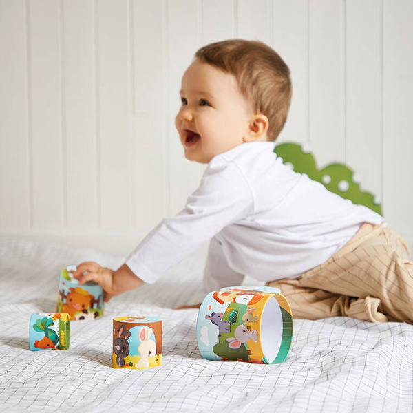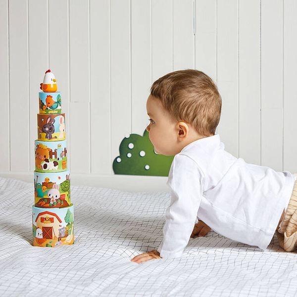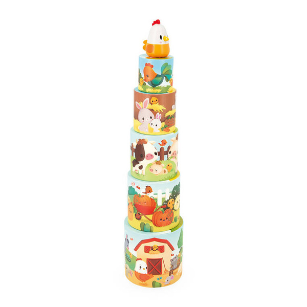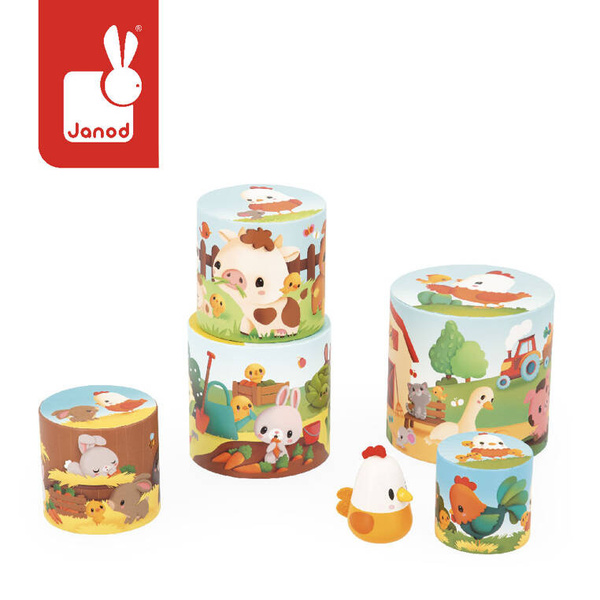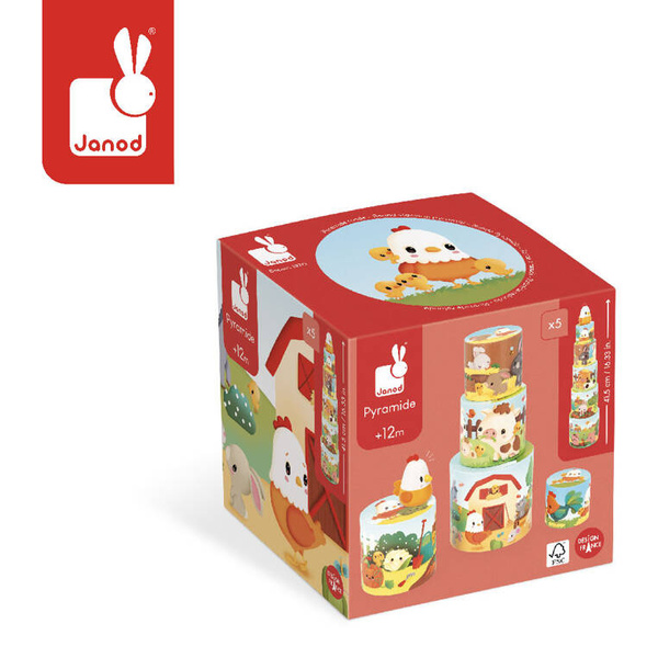 Piarmida Kurka z kolekcji Farma francuskiej marki JANOD składa się z 5 klocków – walców, wykonanych z solidnego kartonu oraz drewnianej kurki. Klocki mają różne wielkości, dzięki czemu można je układać jeden na drugim lub chować jeden wewnątrz drugiego. Są poręczne i ciekawie ilustrowane scenkami z życia na farmie. Układanka pomaga dzieku zrozumieć pojęcie rozmiarów i sekwencji. Drewnianą kurkę można posadzić na czubku stworzonej piramidy lub ukryć pod dowolnym elementem. Zabawka została zaprojektowana we Francji. Zapakowana jest w estetyczne kartonowe pudełko. Idealnie nadaje się na prezent.