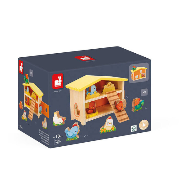 Drewniany domek Mój pierwszy kurnik z kolekcji Farma francuskiej marki JANOD to piętrowy drewniany budynek z pochyłą platformą oraz 8 kurkami i kurczaczkami, które można umieszczać na dowolnych poziomach lub wokół niego, tworząc przy tym różne opowieści z życia na farmie. Okienko na górnym poziomie ma kształt jajka, a na dolnym – jednej z kurek, dzięki czemu pełni też rolę mini-sortera. Zabawka została zaprojektowana we Francji. Zapakowana jest w estetyczne kartonowe pudełko. Idealnie nadaje się na prezent.