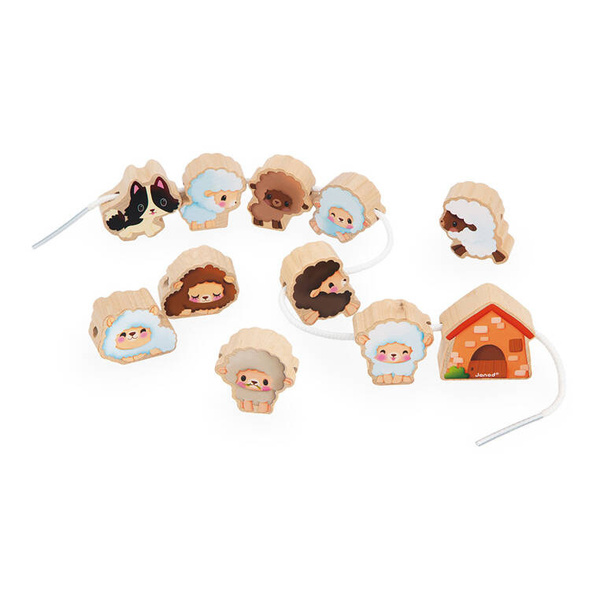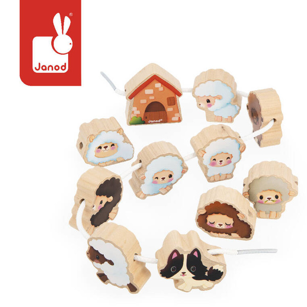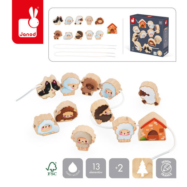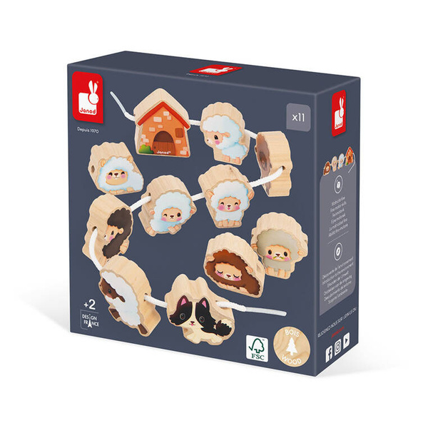 Nawlekanka z drewnianymi owieczkami z kolekcji Farma francuskiej marki JANOD to zabawka, rozwijająca małą motorykę, koordynację ręka-oko, sprawność dłoni i palców oraz skupiająca uwagę dziecka. W zestawie są dwa białe sznurki z laminowanymi końcówkami, na które można nawlekać drewniane elementy: 9 owieczek, 1 budynek farmy i 1 psa pasterskiego, tworząc przy tym różne opowieści z życia na farmie. Zabawka została zaprojektowana we Francji. Zapakowana jest w estetyczne kartonowe pudełko. Idealnie nadaje się na prezent.