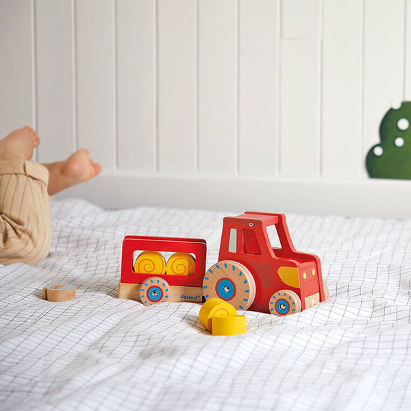 Drewniany traktor do ciągnięcia serii Farma francuskiej marki JANOD będzie świetnym towarzyszem pierwszych kroków dziecka. Jest estetycznie wykonany, ma piękny energetyzujący czerwony kolor, przyczepę oraz 6 akcesoriów: cztery bele siana, kurkę i owieczkę. Szeroki rozstaw kół zapewnia pojazdowi stabilność. Zabawka zaprojektowana została we Francji. Jest zapakowana w estetyczne kartonowe pudełko. Idealnie nadaje się na prezent.
