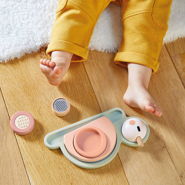 Drewniana układanka sensoryczna z serii Sweet Cocoon francuskiej marki JANOD to zabawka, rozwijająca małą motorykę, koordynację ręka-oko, sprawność dłoni i palców, stymulująca zmysły oraz rozbudzająca ciekawość. W zestawie jest podkładka-ślimak, na której można układać drewniane elementy – od największego do najmniejszego. Każdy z tych elementów na ponadto strukturę, która stymuluje zmysł dotyku. Zabawka została zaprojektowana we Francji. Zapakowana jest w estetyczne kartonowe pudełko. Idealnie nadaje się na prezent.
