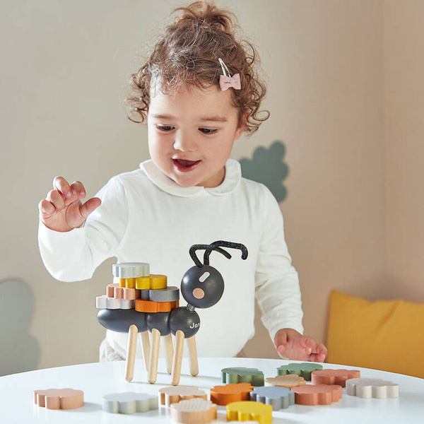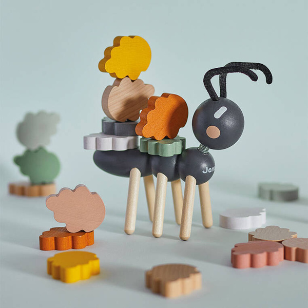 Gra zręcznościowa balansowa Mrówka z serii Sweet Cocoon francuskiej marki JANOD to wspaniała zabawa, zarówno dla kilkorga, jak i jednego dziecka. Zestaw składa się z drewnianej czarnej mrówki oraz 20 drewnianych listków dębu w kilku kolorach, które należy na niej umieścić w taki sposób, by z niej nie spadły. Gracz, który doprowadzi do upadku liści – przegrywa.