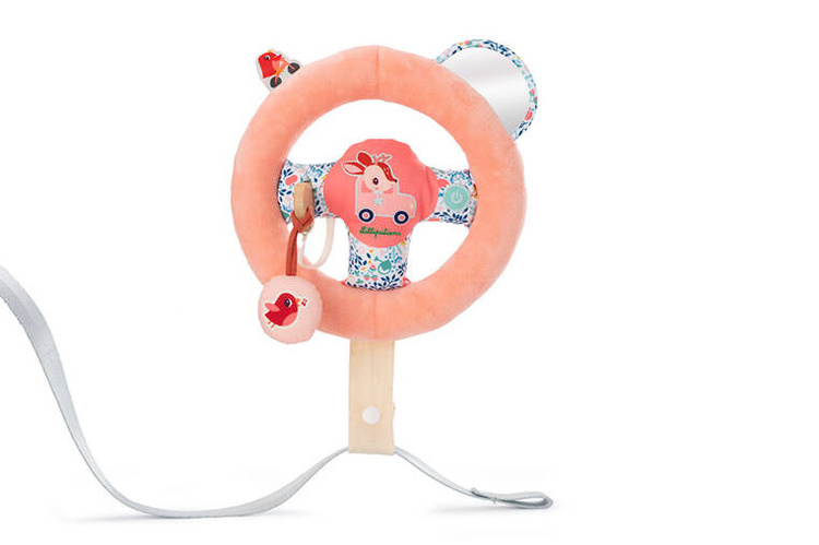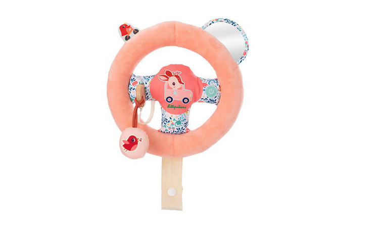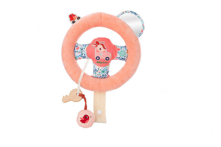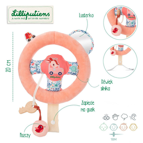 Aktywizująca miękka kierownica z kolekcji Sarenka Stella belgijskiej marki Lilliputiens to niebanalne i wielofunkcyjne źródło rozrywki i nauki dla ciekawskich maluszków. Zabawka idealnie sprawdzi się np. podczas podróży czy długiego spaceru, ponadto posiada pasek z guziczkiem pozwalający zamocować ją w dowolnym miejscu. Przyjemna w dotyku pluszowa kierownica oferuje wiele opcji, m.in.: wydaje dźwięk silnika, drewniany kluczyk na sznureczku z breloczkiem-piszczałką, otwór „stacyjkę”, w której ten można kluczyk umieścić, bezpieczne i miękkie boczne lusterko oraz odstającą naszywkę z ptaszkiem na rowerze. Zabawka jest solidnie wykonana i w pełni bezpieczna. Zaskakuje i pobudza dziecięcą wyobraźnię. Rozwija koordynację ręka-oko, małą motorykę (chwytanie, wkładanie, wyjmowanie, obracanie, naciskanie), aktywizuje zmysł słuchu (dźwięki), dotyku (różne materiały i faktury, odstające elementy) i wzroku (lusterko).