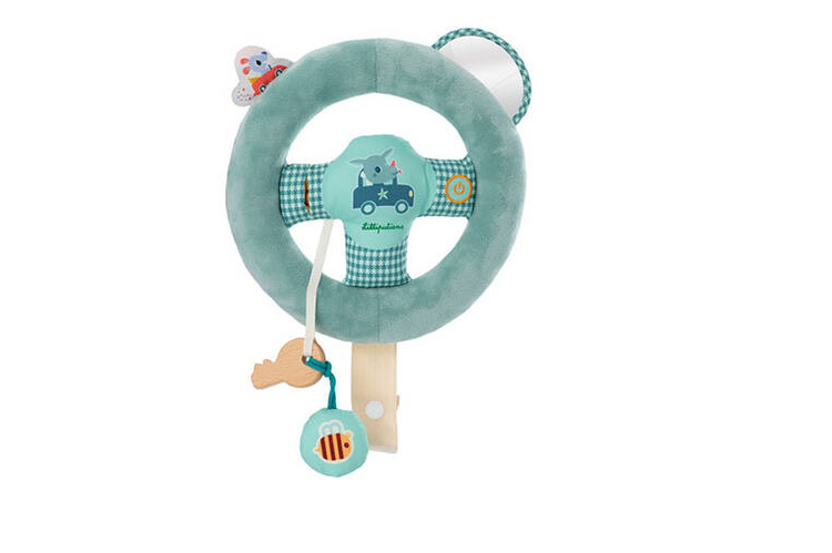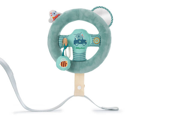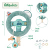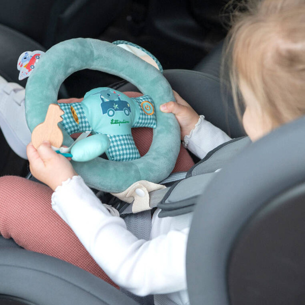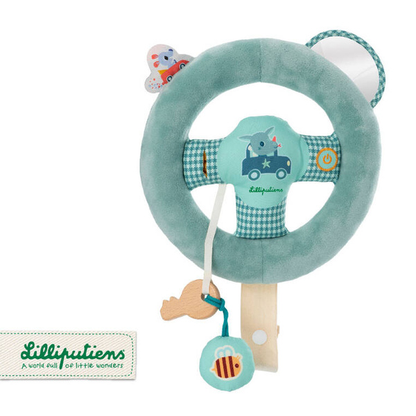 Aktywizująca miękka kierownica z kolekcji Smok Joe belgijskiej marki Lilliputiens to niebanalne i wielofunkcyjne źródło rozrywki i nauki dla ciekawskich maluszków. Zabawka idealnie sprawdzi się np. podczas podróży czy długiego spaceru, ponadto posiada pasek z guziczkiem pozwalający zamocować ją w dowolnym miejscu. Przyjemna w dotyku pluszowa kierownica oferuje wiele opcji, m.in.: wydaje dźwięk silnika, drewniany kluczyk na sznureczku z breloczkiem-piszczałką, otwór „stacyjkę”, w której ten można kluczyk umieścić, bezpieczne i miękkie boczne lusterko oraz odstającą naszywkę z myszką jadącą samochodem. Zabawka jest solidnie wykonana i w pełni bezpieczna. Zaskakuje i pobudza dziecięcą wyobraźnię. Rozwija koordynację ręka-oko, małą motorykę (chwytanie, wkładanie, wyjmowanie, obracanie, naciskanie), aktywizuje zmysł słuchu (dźwięki), dotyku (różne materiały i faktury, odstające elementy) i wzroku (lusterko).