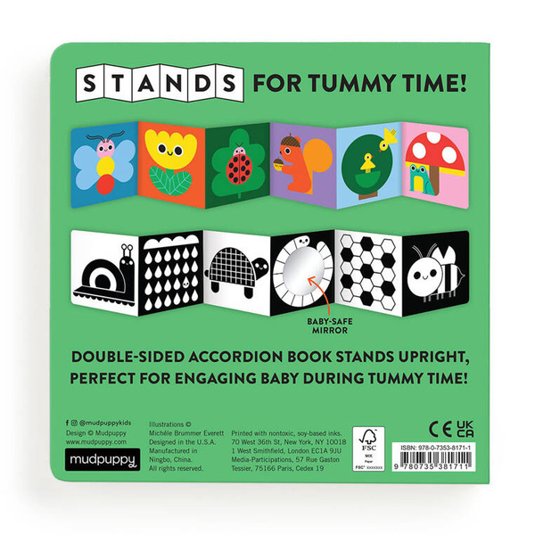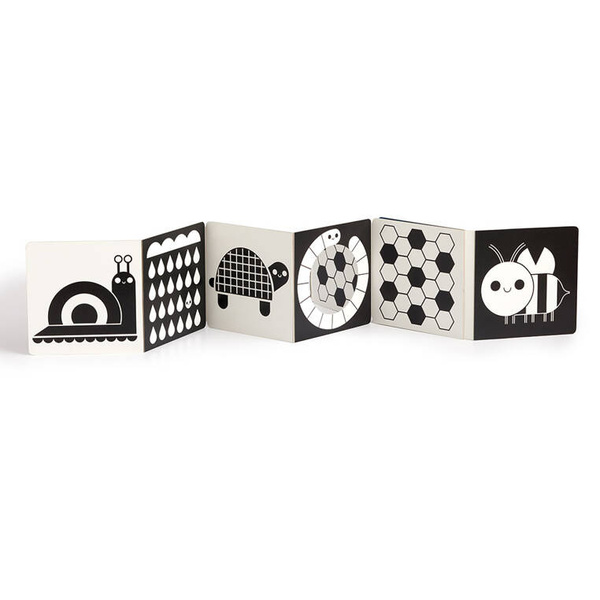 Harmonijkowa książeczka Natura amerykańskiej marki MUDPUPPY to idealna pierwsza lektura maluszka. Wykonana z solidnego kartonu książka rozkłada się na długość i można ją postawić przed leżącym na brzuszku dzieckiem, aby obserwowało przedstawione na kolejnych stronach ilustracje. Po jednej stronie są to kontrastowe czarno-białe obrazki, idealne dla najmłodszych, po drugiej – kolorowe, lecz nadal z prostą, dostoswaną do dziecięcej percepcji grafiką. Ilustracje przedstawiają elementy natury: rośliny, zwierzęta, zjawiska pogodowe. Na jednej z nich znajduje się ponadto lustrzana powierzchnia, dodatkowo stymulująca wzrok malucha. Książeczka jest estetycznie wykonana. Idealnie nadaje się na prezent.