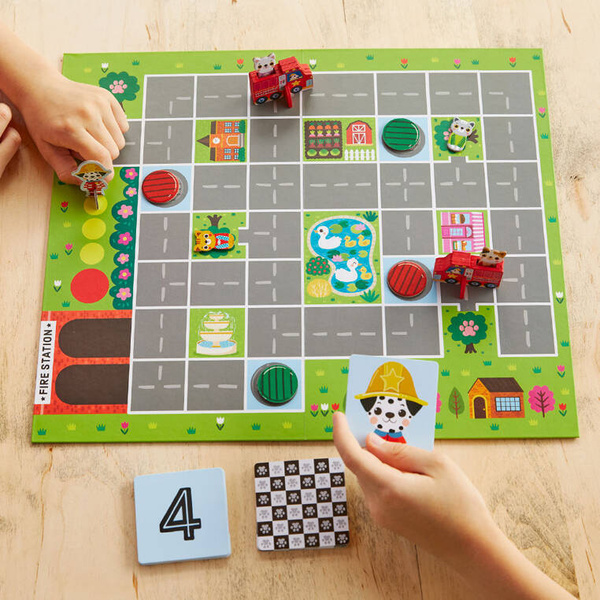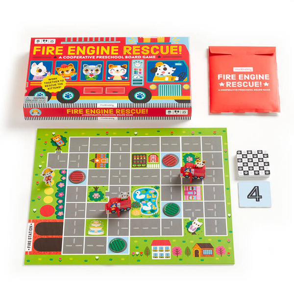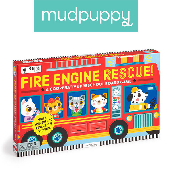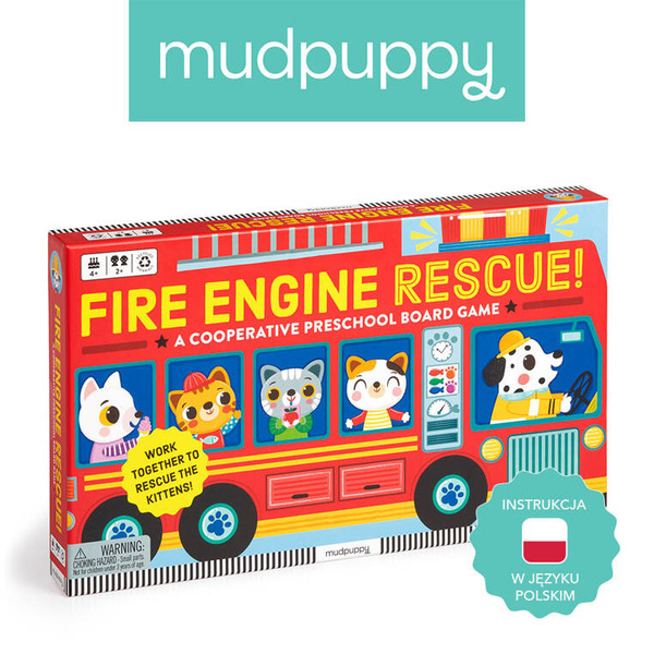 Gra planszowa Straż pożarna na ratunek! amerykańskiej marki MUDPUPPY składa się z planszy do gry z mapą uliczek i skwerów, 27 kart z ruchami, 4 żetonów z sygnalizacją świetlną, 4 żetonów z postaciami kotków, 2 drewnianych wozów strażackich i 1 komendanta straży pożarnej. Zadaniem graczy jest uratowanie kotków, które utknęły na drzewach oraz pomoc wozom strażackim wrócić do remizy, zanim dotrze tam komendant. Sygnalizacja świetlna może w tym pomóc lub przeszkodzić. Zabawa polega na wspólnym działaniu dla osiągnięcia celu. W grze może brać udział 2 lub więcej osób. Uczy ona planowania i cierpliwości, a przy okazji trenuje szybkość reakcji i spostrzegawczość. Gra zawiera instrukcję. Zapakowana jest w estetyczne kartonowe pudełko z grafiką wozu strażackiego. Idealnie nadaje się na prezent.